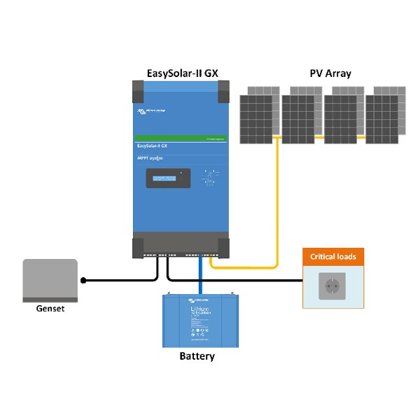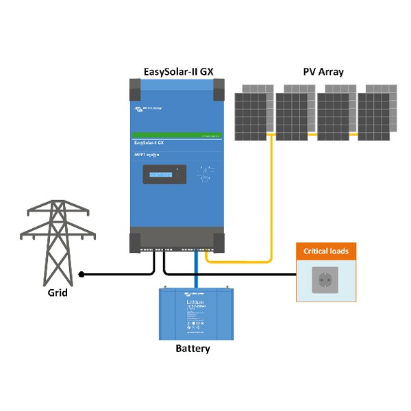 Victron EasySolar II je kombinacija solarnega regulatorja, razsmernika, polnilnika akumulatorjev in prehodnega sistema v eni napravi. Odličen v hibridnih napajalnih sistemih. Odličen v hibridnih solarnih sistemih, ESS samooskrbnih sistemih s hranilniki, sistemih neprekinjenega napajanja, aplikacijah v pomorstvu, prometu in na kopnem.